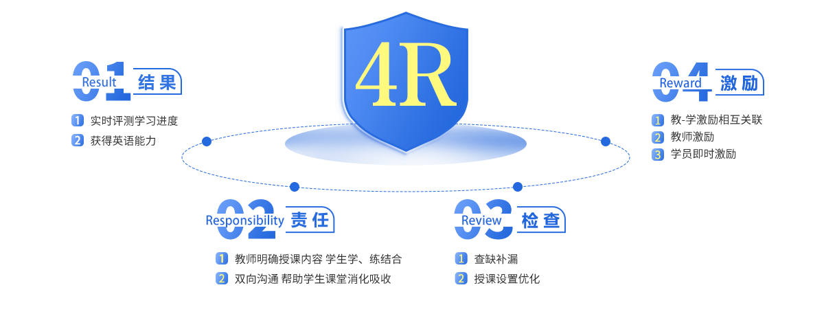 4R,代表着 Result (结果)、Responsibility (责任)、Review (检查)和 Reward (激励)。四者有机结合,形成“以结果为起点,又以结果为归 宿”的科学、实用。新航道将4R系统运用于个性化课堂,把复杂的问题简单化、简单的事情量化、量化的事情标准化,输出学员专属解决方案。